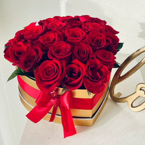 A heart shaped box full of 24 fragrant roses, carefully arranged and nestled. It's a gift that will...
