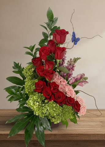 This classic bouquet of 18 roses, spray roses and greenery, is the perfect gift for a loved one....
