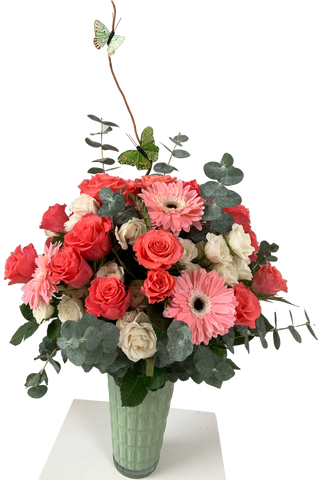 Featuring a stunning arrangement of roses, gerberas, and assorted greenery, elegantly presented in a ceramic vase with a...
