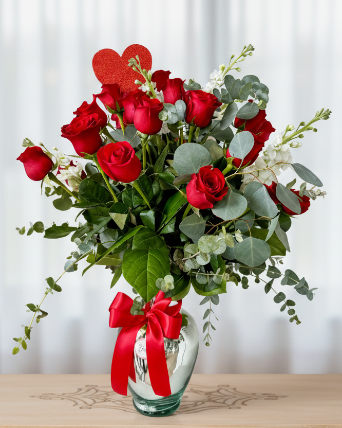 Celebrate LOVE with 25 beautiful roses, fragrant stocks, and lush mixed foliage, all elegantly arranged in a silver or gold glass base with a charming ribbon. A perfect gift to make hearts bloom on Valentine’s Day or any special occasion!