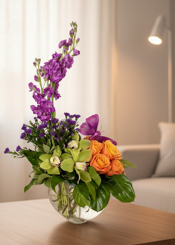 "Blossom Curve" is a sight to behold. This extraordinary arrangement, featuring 8 roses, 3 cymbidium orchids, stock flowers and greenery, includes a striking white or clear bowl base with a cute decorative detail.