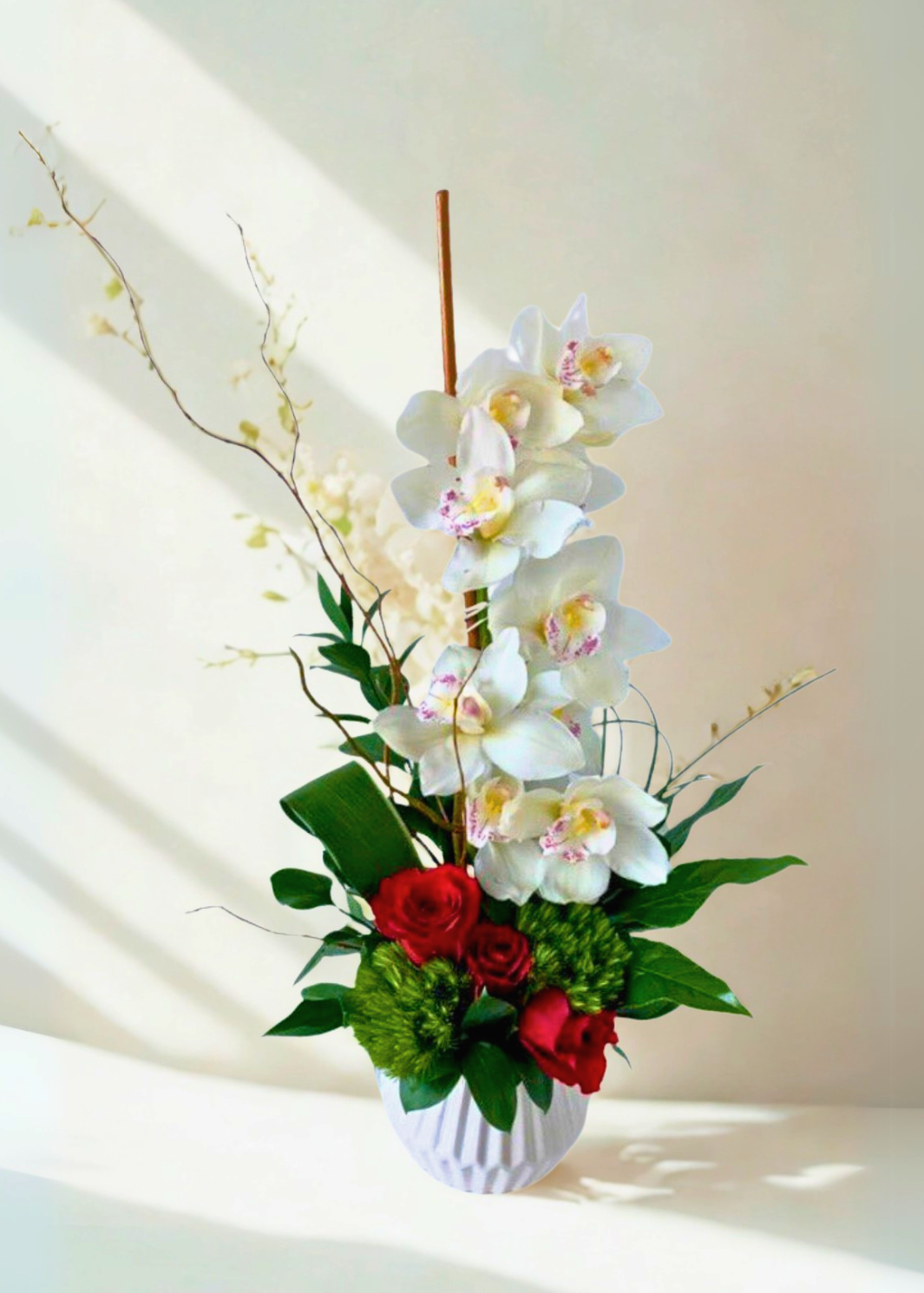 This elegant arrangement showcases stunning cymbidium orchids complemented by lush greenery and pops of red roses. Perfect for adding a touch of sophistication to any room or occasion.
